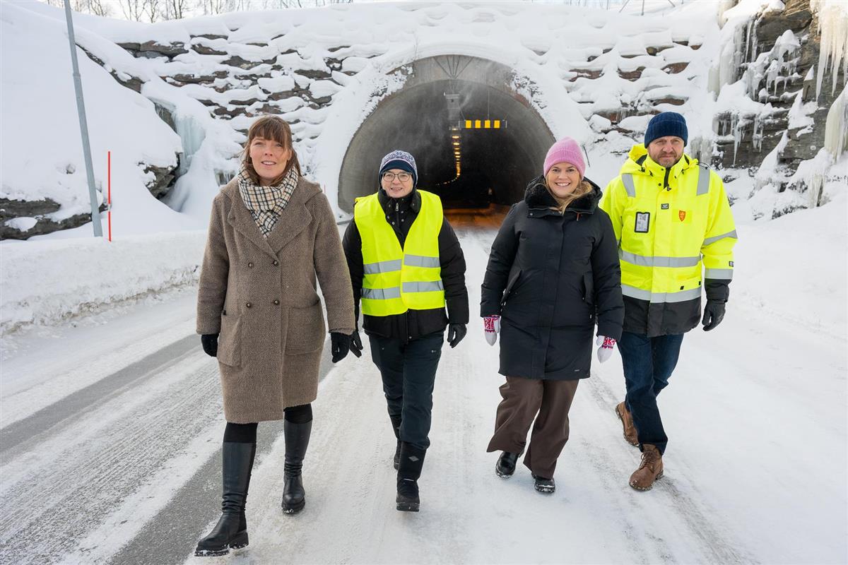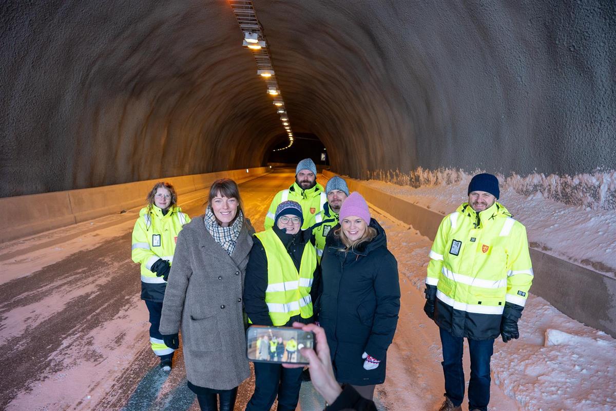 Fotoseanse i tunnelen: Bak fra venstre byggelederne Karina Solstad, Lars Tore Johnsen og kontrollingeniør Terje Nilsen. Foran står venstre leder for hovedutvalget for samferdsel Mari Siljebråten, leder i Vikran Utviklingslag Hilde Ovesen, fylkesordfører Kristina Torbergsen og samferdselssjef Bjørn H. Kavli.