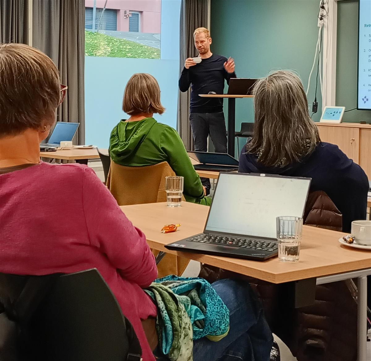 Trygve Kikut fra KS bibliotek snakker om KS digital og den nye digitale formidlingsplattformen.Vi har fått flere ønsker om KI på programmet, og denne gangen fikk vi det til. Rådgiver Anita Hvarnes Evensen fra Vestfold fylkesbibliotek har jobbet mye med hvordan KI kan brukes. Hun ga oss en innføring og oversikt før vi fikk prøve oss på oppgaver med bruk av Copilot, Gemini og ChatGPT. Vi fikk tilbakemelding om at dette var nyttig lærdom.