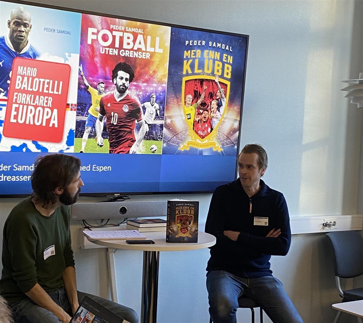 Så fulgte en samtale mellom bibliotekar Espen Andreassen fra Tromsø bibliotek og forfatteren Peder Samdal. Samdal har gitt ut flere bøker om fotballspillere og klubber med fokus på samfunnet rundt mer enn selve spillet. Den siste er “Mer enn en klubb” som ble nominert til Brageprisen i 2022. Han ønsker å få fram at fotballklubber kan stå for veldig forskjellig ting og at de har en kraft i seg som kan brukes til å skape positive endringer i samfunnet. I Vålerenga står kampen mot rasisme sentralt, i Odd er det fokus på miljø, og i Lyon handler det om likestilling. Men klubber kan også misbrukes av farlige krefter, eiere fra andre land som ønsker å dekke over kritikkverdige forhold i sine hjemland. Det som kalles for sportsvasking.