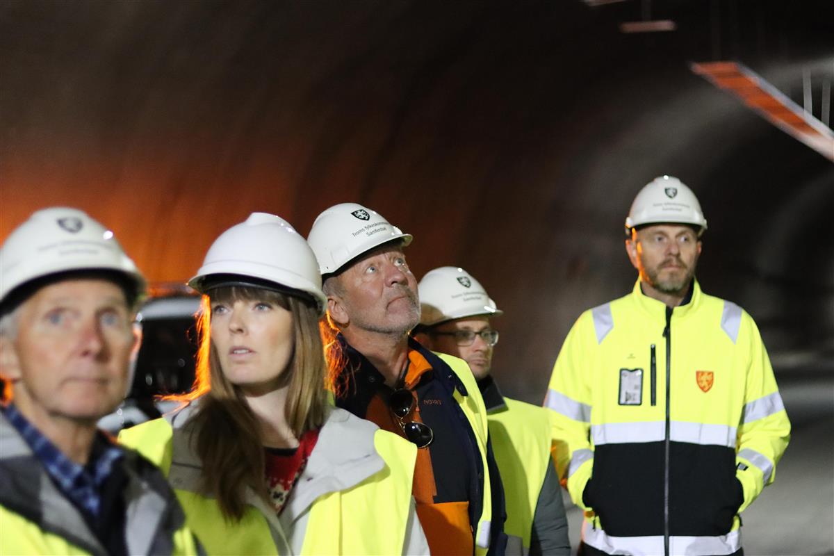 Delegasjonen fikk være med prosjektet i Mellom- og Langnestunnelen, der anleggsarbeidene er godt i gang. Mellomtunnelen er allerede utvidet til det som skal bli fire kjørefelt, og ved rundkjøringa var det mørkt, våt og spennende.
