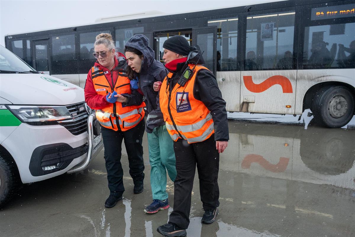 Troms fylkeskommune stilte med busser under den store øvelsen i Tromsø under Cold Respons denne uken. En «skadd» markør hjelpes av Røde Kors.