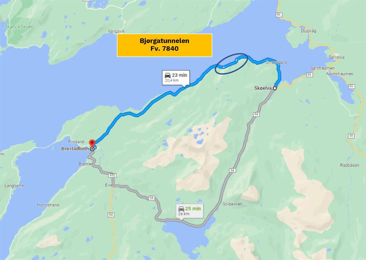 Omkjøring er mulig fra Skøelv på fylkesvei 84 via Elvevoll og videre på fylkesveg 852 til Brøstadbotn.